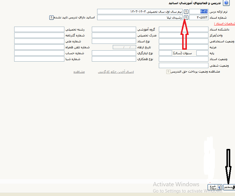 و از بالای صفحه روی علامت سوال کلیک نمایید و سپس ترم مورد نظر را انتخاب کنید و در نهایت در پایین صفحه گزینه جستجو را بزنید و در صفحه بعد گزینه ارسال آخرین حکم کارگزینی را کلیک نمایید.