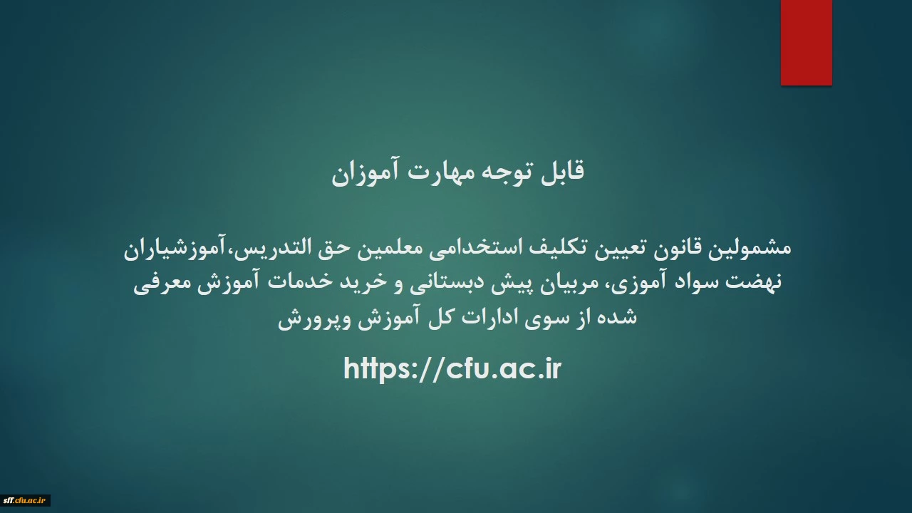 ضمن عرض تبریک به اطلاع معرفی شدگان فوق می رساند جهت اطلاع از زمانبندی، مکان و جزییات برگزاری دوره مهارت آموزی سال 1399 (که به دلیل جلوگیری از شیوع بیماری کرونا و حفظ سلامت مهارت آموزان به صورت مجازی برگزار خواهد شد) از روز سه شنبه مورخ 30 دی ماه 99 ب