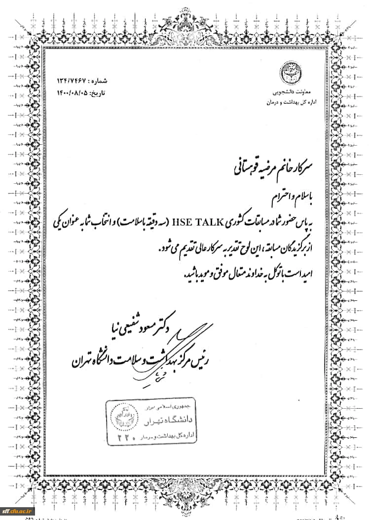 افتخار آفرینی سرکار خانم مرضیه قوهستانی (دانشجو معلم استان فارس) در مسابقه کشوری HSE Talk (سخنرانی سه دقیقه با سلامت) 2