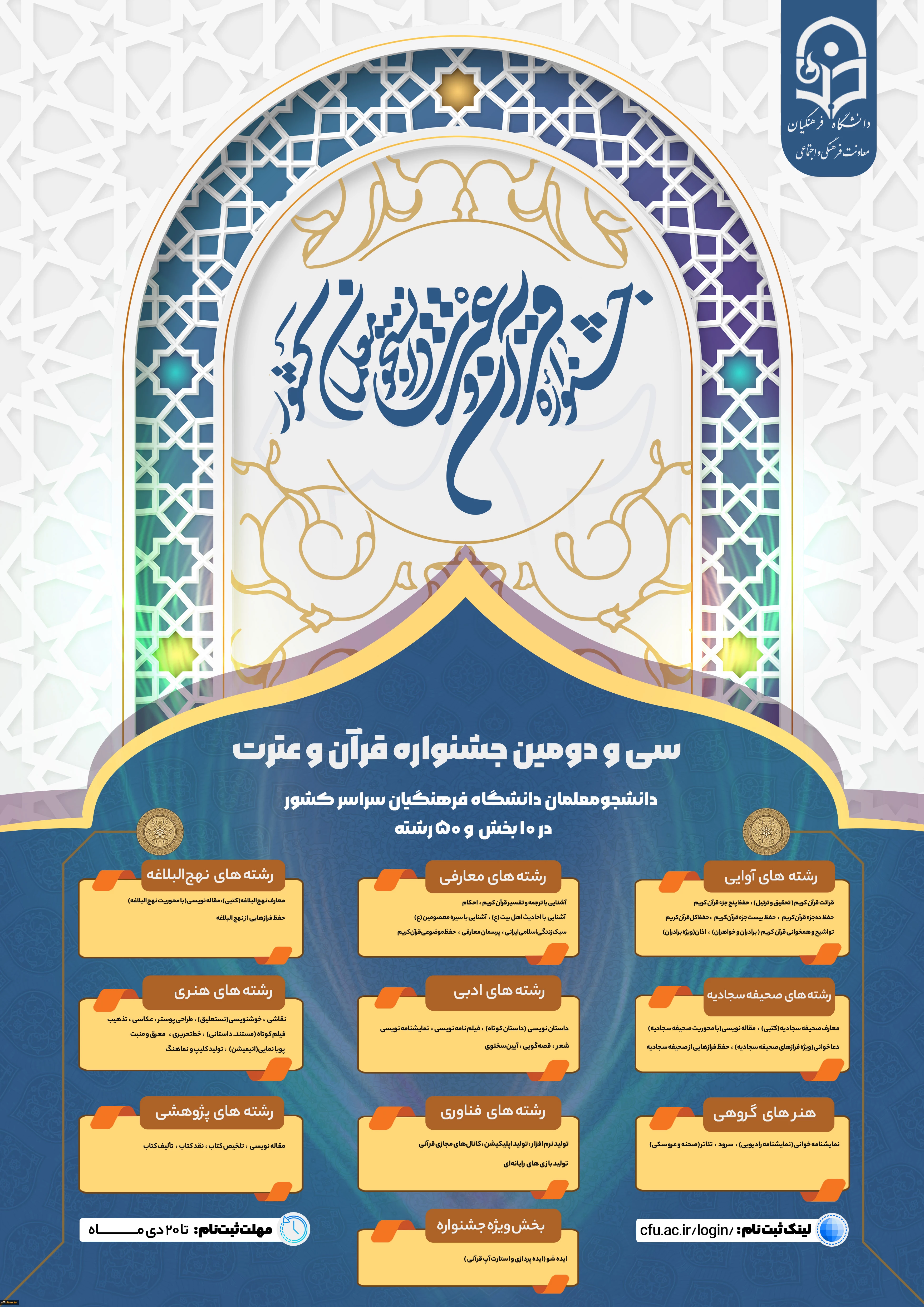 سی و دومین جشنواره قرآن و عترت ویژه دانشجو معلمان دانشگاه فرهنگیان سراسر کشور در 10 بخش و 50 رشته 2