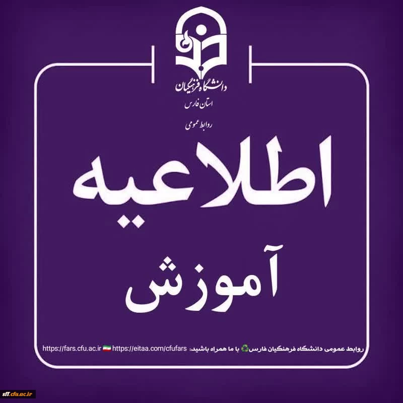 کلاس های آموزشی دانشجویان دانشگاه فرهنگیان فارس از تاریخ ۲۷ بهمن ۱۴۰۴ لغایت ۲۸ اسفند ۱۴۰۴ به صورت غیرحضوری